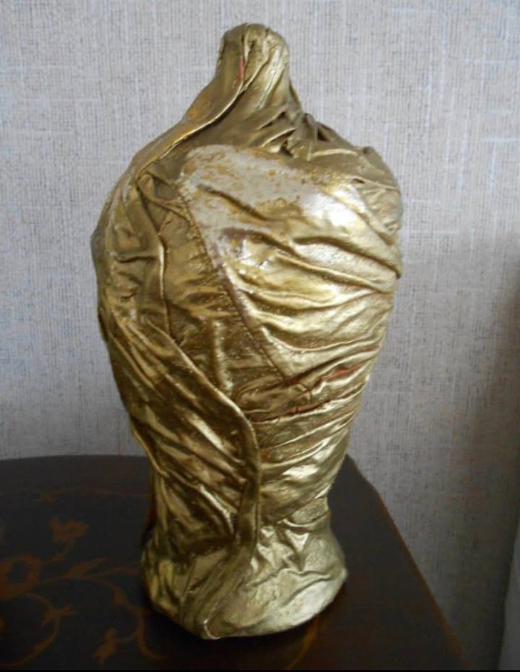 Parlak altın renkte, el yapımı , dokulu yüzeye sahip dekoratif vazo, mekana şık bir hava katar.