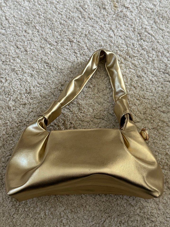 Parlak altın renkli deri kadın çanta, tokalı detaya sahip ve çağdaş tarzda. Klasik zarafete uygun, desensiz ve günlük kullanım için ideal.