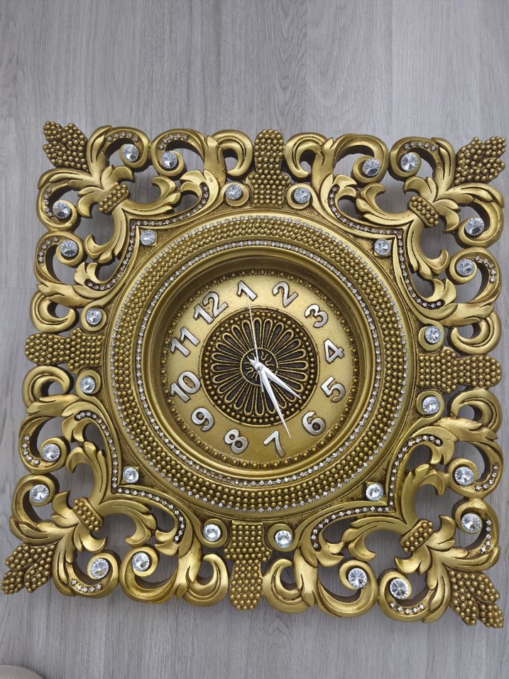 Parlak altın renkli, işlemeli çerçeve plastik degildir maddesini bilmiyorum ağır malzeme camı yoktur.