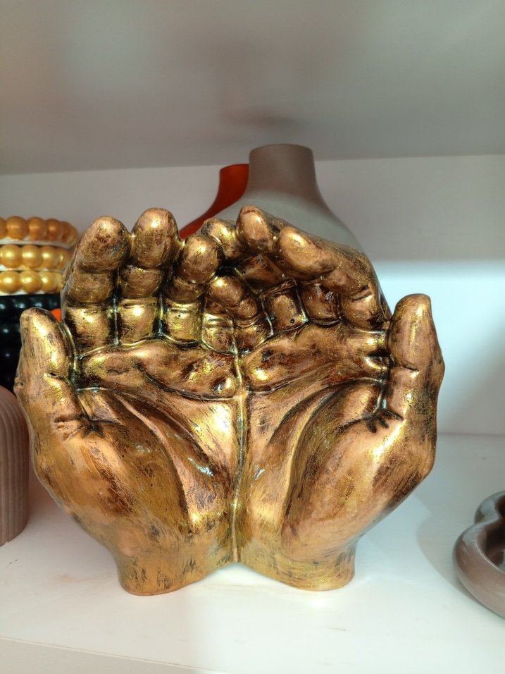 Parlak altın renkli, detaylı dokulu iki el figürü. Doğal el çizgilerini andıran detaylarla süslenmiş dekoratif biblo. ️