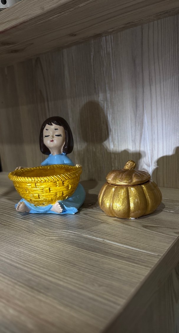 Parlak altın renkli, sepet tutan kız figürü ve kapaklı küçük kabak şeklinde bir kavanoz içerir. El yapımıdır. Sadece duz sus olarak kullanılır boya dolaylı bazı catlak “gorunumleri” mevcuttur