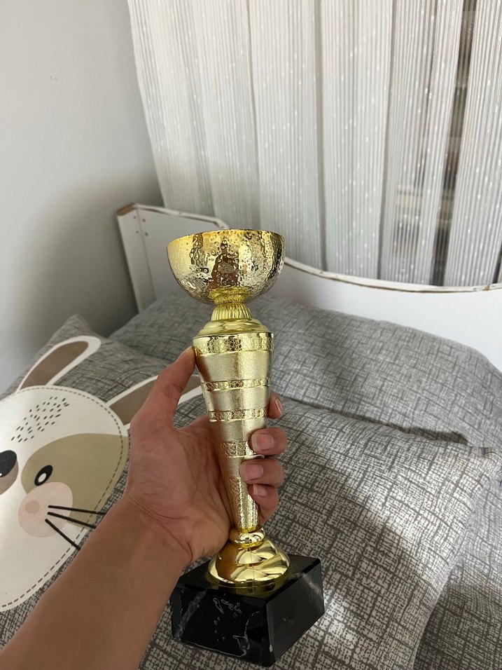 Siyah tabanlı, parlak altın renkli, dokulu kupa tasarımlı figürin.
