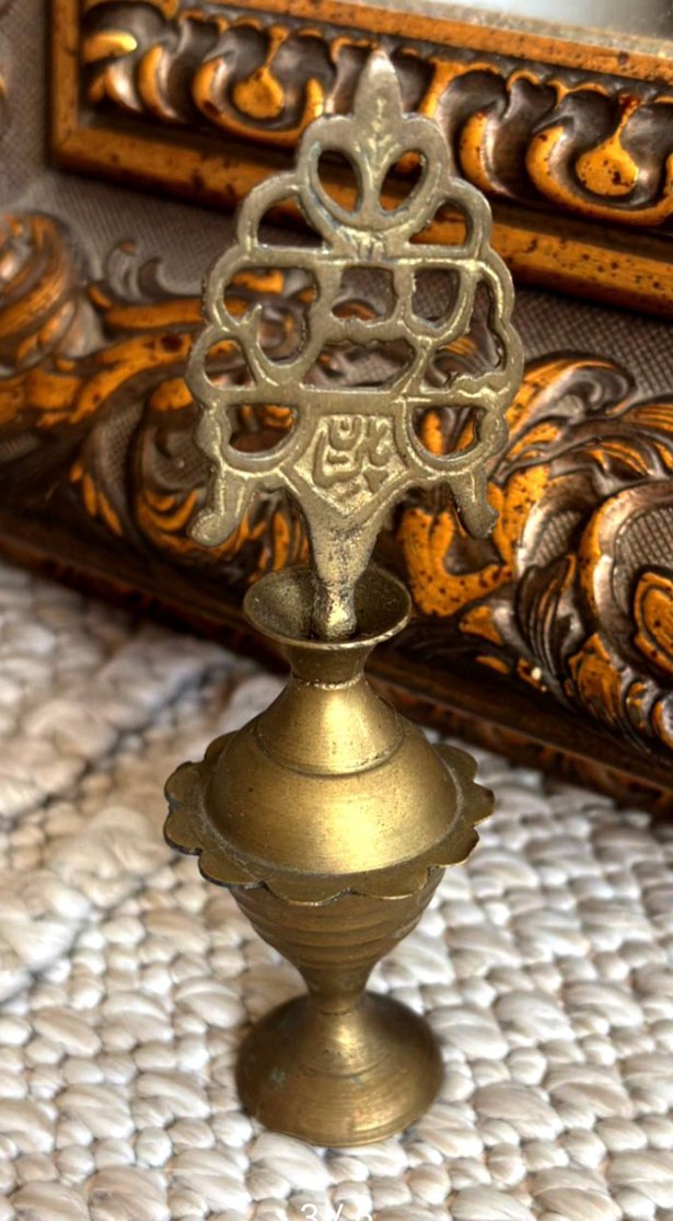 Antika prinç sürmedanlık hijyen kurallarına göre doğallığını bozmadan prille temizlenmiş sadece koyu renk fotoğraftaki gibi bir ton açığa dönmüştür.Yükseklik 11.5 cm En 10 cm Korunaklı paketle yollanacaktır. Prinç ürünler için ilanlarıma balabilirsiniz. 12 Kasıma kadar satılmaz ise fiyatı biraz daha düşürecegim. Osmanlı döneminde “sürmedanlık” veya “kohl box” olarak da bilinir. Sürme, gözlere sürülen doğal bir makyaj ve bakım ürünüdür; hem estetik hem de koruyucu amaçlarla kullanılırmış. Osmanlı İmparatorluğu’nda sürme, göz sağlığı için hem erkekler hem de kadınlar tarafından kullanılırmış Bu pirinç sürme kabının bir kapağı ve kapağın üzerinde ince bir sürme çubuğu bulunurmuş Kullanılması için çubuk göz kapağından çıkarılıp sürmeye batırılıp göz kenarlarına sürülürmüş Çubuk üzerindeki oyma Osmanlı tuğra motifleri ve Arapça yazı, dönemin sanat anlayışını yansıtmakta ve Parlaklığı ve dayanıklılığı pirinç alaşımından gelmektedir. Yaklaşık 10 cm yüksekliğindedir.
