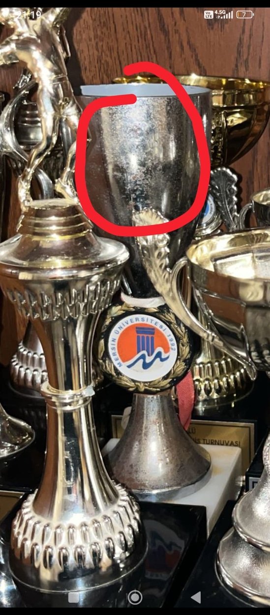 Parlak altın renkli figürin, klasik kupa tasarımı ve önünde üniversite amblemi ile dikkat çekiyor.