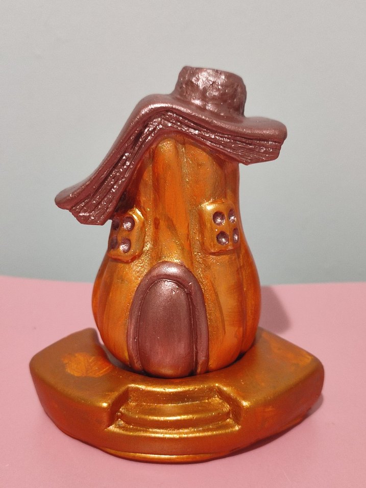 Parlak altın renkte, kıvrımlı çatısı ve detaylı pencereleri, kapısı olan minyatür ev figürini. Altın renkli kaide üzerinde duruyor.