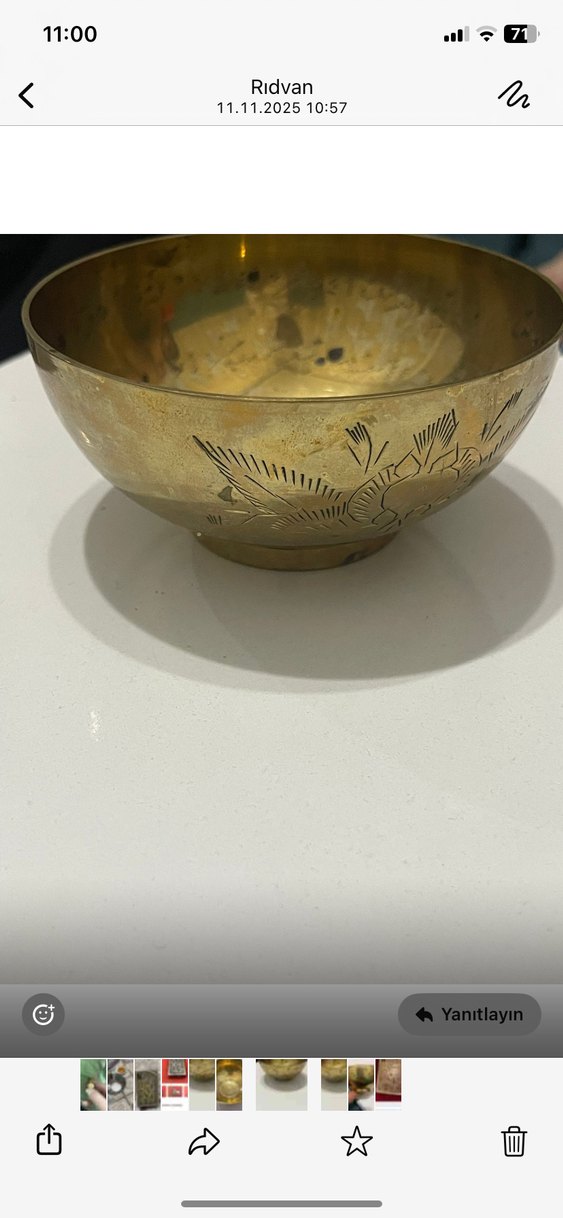 Parlak altın renkli, geleneksel tarzda, düz yüzeye ve hafif oyma detaylara sahip bir kase. Şık ve sade bir sofra ürünü. ️