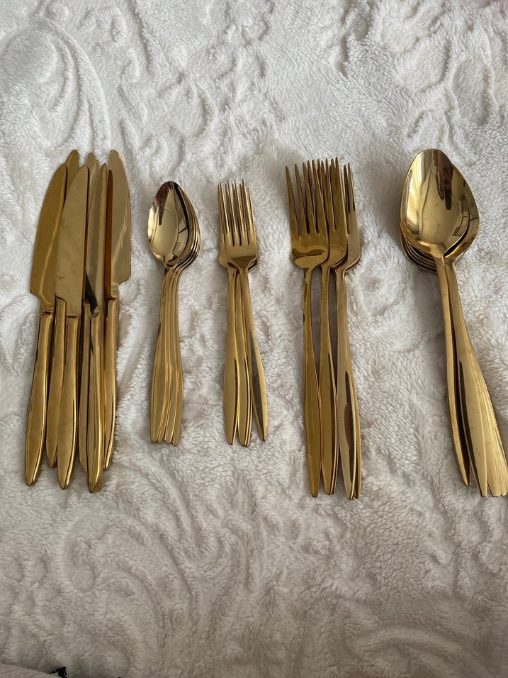 Parlak altın renkte bıçak, çatal ve kaşıklardan oluşan şık bir çatal kaşık seti. hiç kullanılmadı paslanmaz çeliktir makinede yıkanır