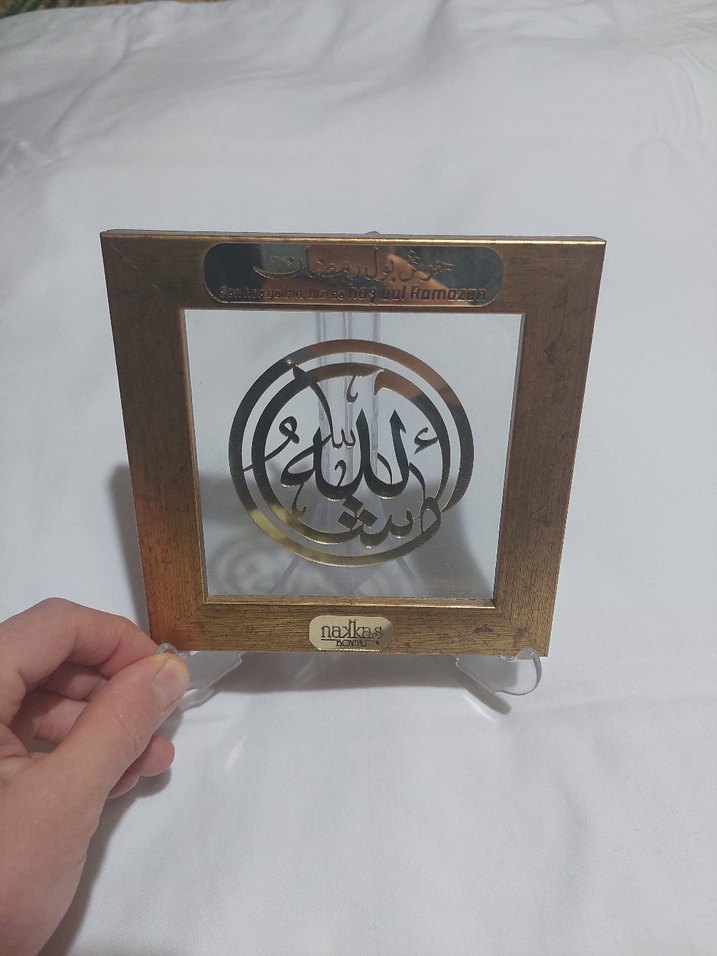 Parlak altın renkli, kare çerçeveli hat sanatı tablosudur. Ortasında İslami kaligrafi bulunur, yansıtıcı yüzeye sahiptir. ️14×14 cm