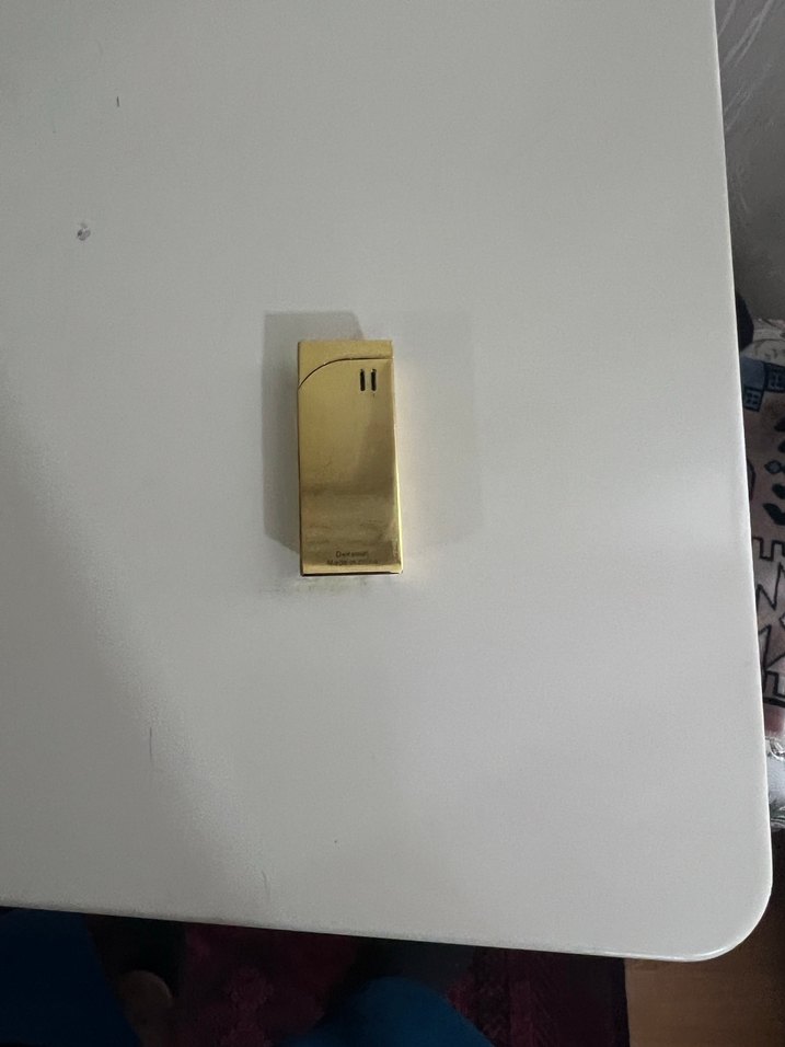 Parlak altın renginde, şık dikdörtgen tasarımlı ve kompakt boyutta hediye çakmak.