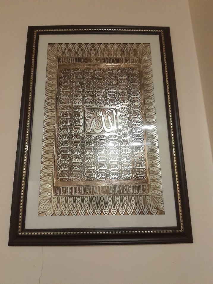 Parlak altın renkli İslami hat yazısı bulunan, ortasında Allah ismi yer alan, koyu çerçeveli dekoratif tablo. ️
