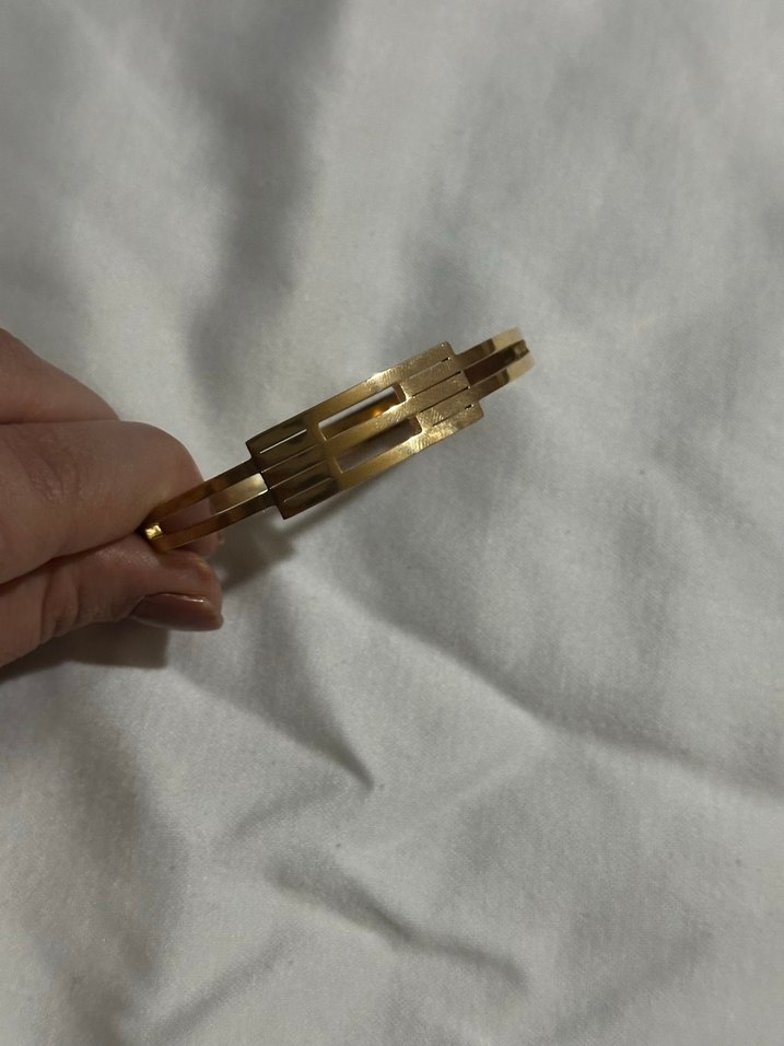 Parlak altın renkli, yarık detaylı çağdaş tasarıma sahip kadın bileklik, vintage stilini günlük kullanıma sunar. ✨