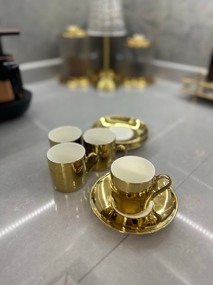 Parlak altın renkli kahve fincanları ve uyumlu tabağı içeren set, espresso veya Türk kahvesi servisinde şıklık sunar. ☕