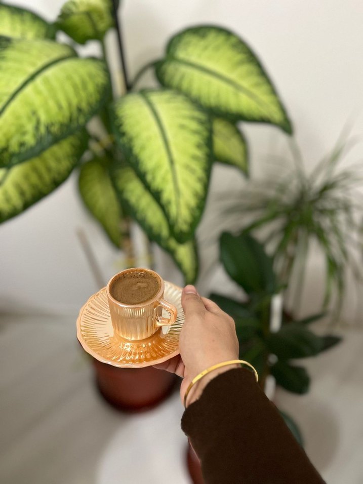 nostaljik Parlak Altın Renkli Kahve Fincanı ve Tabağı