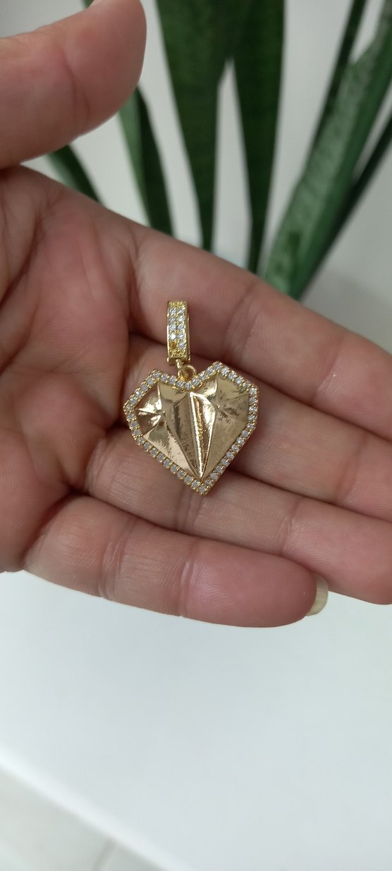 Parlak taşlarla çevrili, simli kalp şeklinde altın renkli midi uzunlukta kolye, romantik akşamlar için uygun.