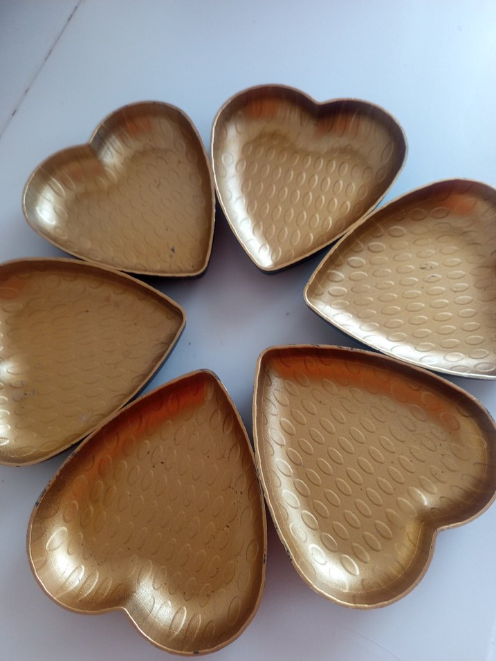 Parlak altın renkli, kalp şeklinde ve deseniz yüzeye sahip tabak seti, çerezlik .. ️