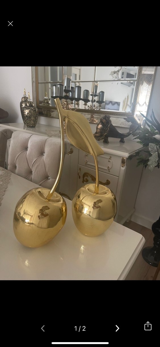 Parlak altın renkli, yapraklı iki kiraz şeklinde dekoratif biblo.