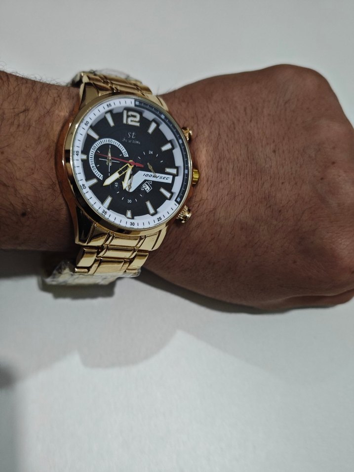 Parlak altın metal kayışa sahip erkek saati, siyah beyaz kadran ve çoklu alt kadranlarla klasik ve çağdaş tarzı bir araya getiriyor. ⌚