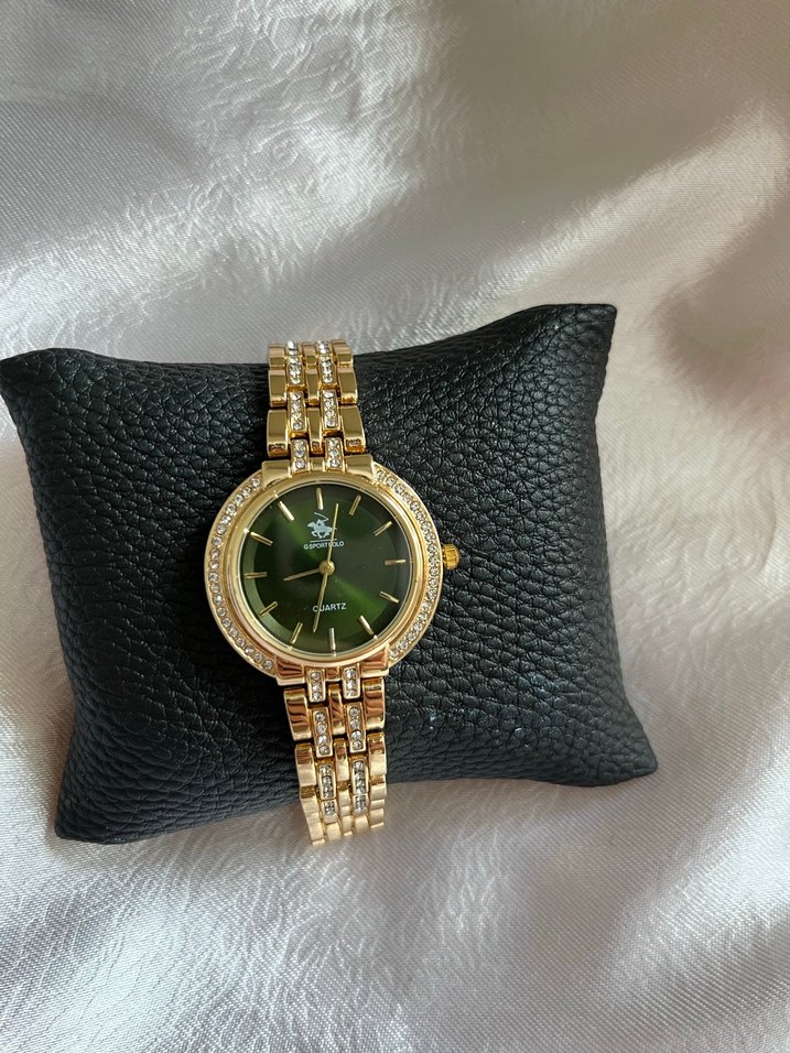 Parlak altın renkli, kemerli bilezikli ve koyu yeşil kadranlı kadın saati. Modern klasik tarzıyla zarafet ve zamansızlığı bir arada sunar. ⌚