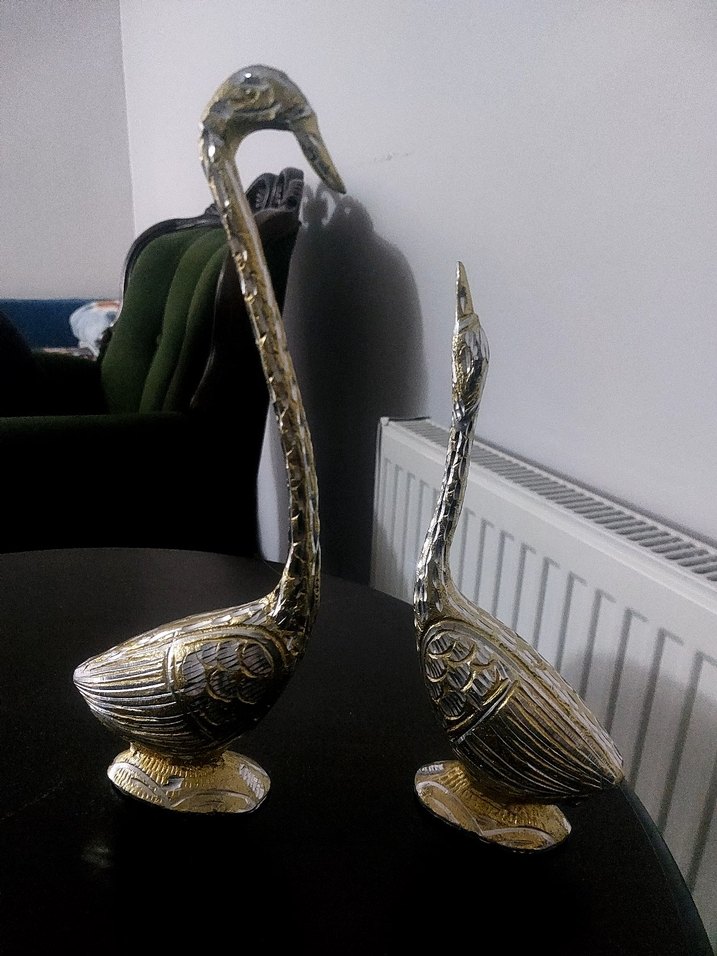 Detaylı tüylü, parlak altın renkli kuğu figürleri. Dekorasyona zarif bir dokunuş katar.