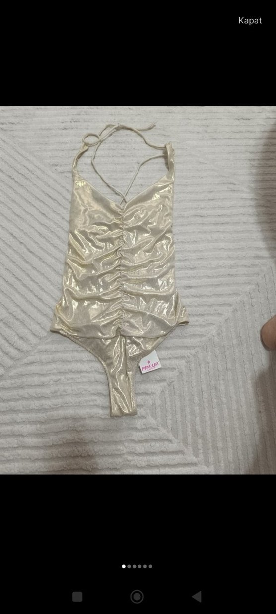 Parlak altın renkli, askılı kısa kesim kadın mayo. Büzgülü tasarımıyla dikkat çeker, beden 42 yazıyor ama sml bedenlere uygun