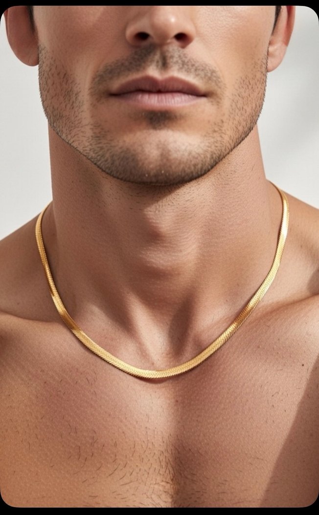 Parlak yılan desenli, altın renkli ve midi uzunlukta olan bu kolye, minimalist ve çağdaş bir tarz sunar.