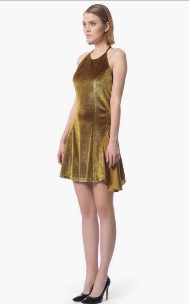 Parlak Altın Renkli Mini Askılı Pilili Elbise