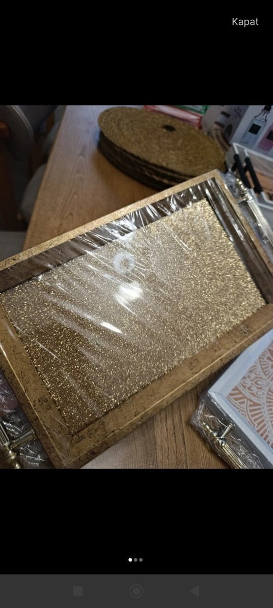 Parlak altın renkli, dokulu yüzeye sahip mutfak tepsisi, servis veya düzenleme için uygundur. ✨ 2 adet mini tepsi 34×18 cm ölçüleri