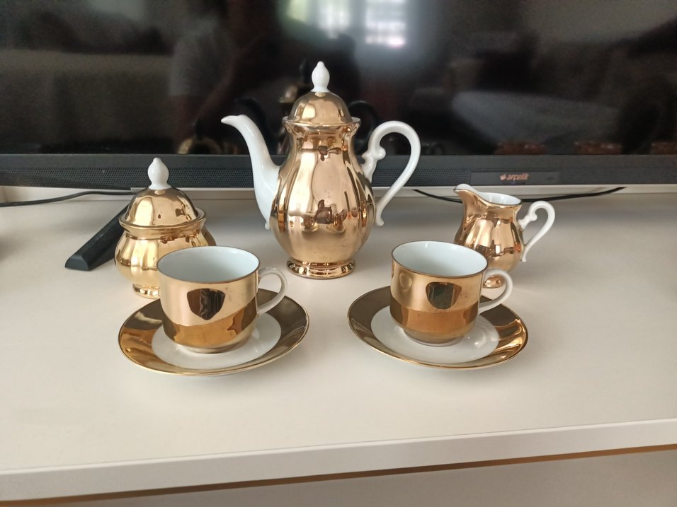 Parlak altın renkte, desensiz modern klasik tarzda çaydanlık, iki fincan, tabak ve sütlükten oluşan çay seti. 50 yıllık alman çay seti ☕