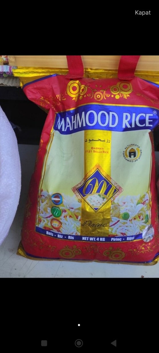 Parlak altın renginde, "MAHMOOD RICE" baskılı mutfak önlüğü, yemek yaparken koruma sağlar.
