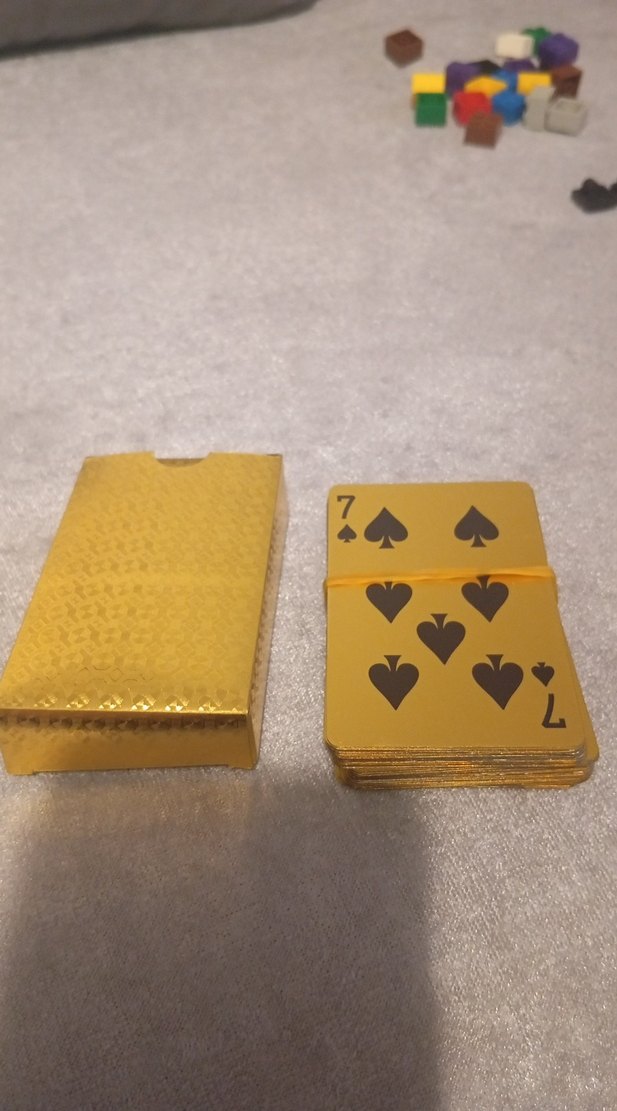Parlak altın renkli oyun kartları ve uyumlu kutusu, kart oyunları için uygundur. Kartlarda siyah semboller belirgindir.