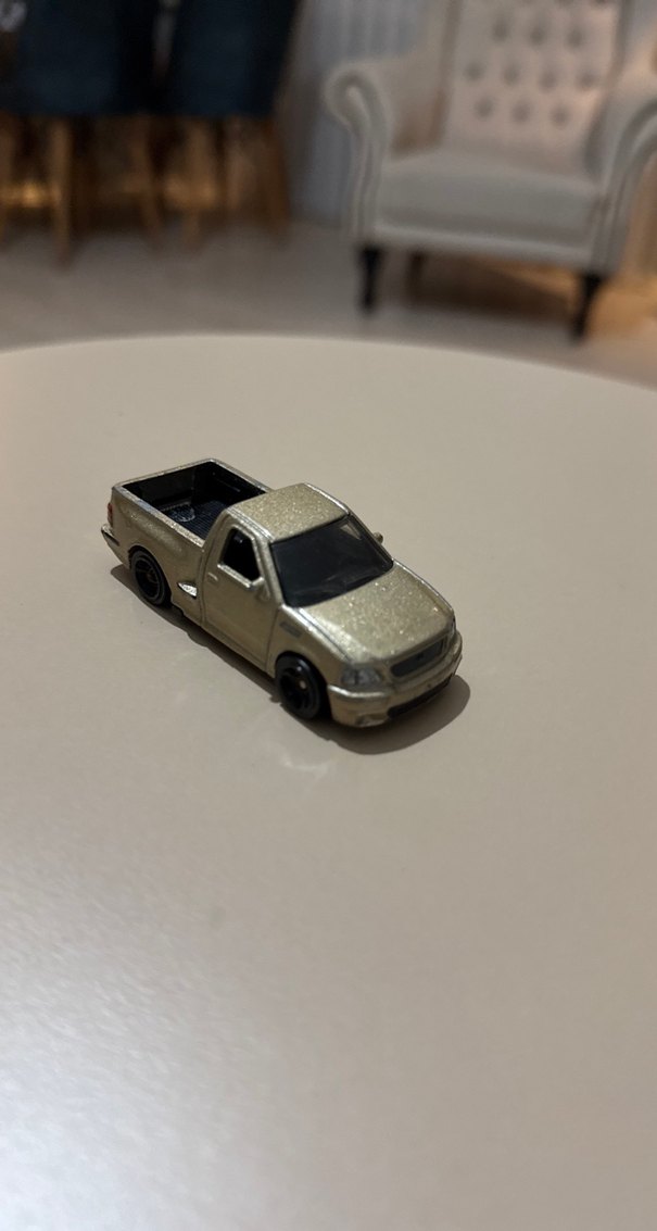 Parlak altın renkli oyuncak kamyonet, siyah bagaj ve tekerlek detaylarına sahip. Oyun veya koleksiyon için uygun.