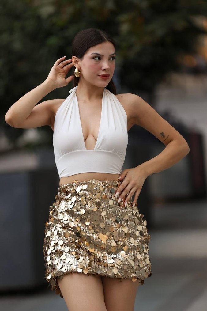 Parlak altın renkli payetlerle süslenmiş, yılan desenli, sentetik kumaştan yapılmış, vücuda oturan mini etek. ✨