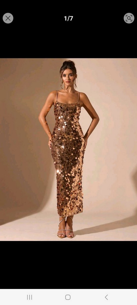 İnce askılı, straplez yaka ve parlak altın payetlerle kaplı, vücuda oturan uzun abiye elbise. Cesur parti stilleri için ideal. ✨