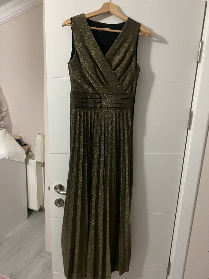 Kolsuz, V yakalı ve pilili etekli uzun, vücuda oturan abiye elbise. Parlak altın renk, klasik ve modern şıklığı bir araya getiriyor. Ofis etkinlikleri için uygun. ✨