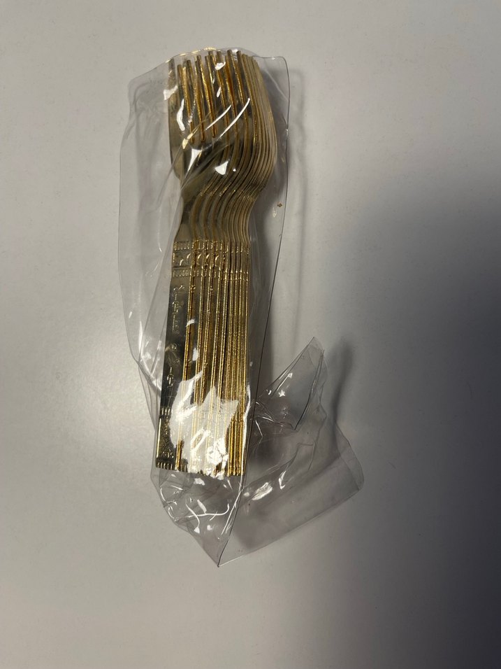 Parlak altın renkli plastik çatallardan oluşan set, şeffaf plastik ambalajda paketlenmiştir. ✨