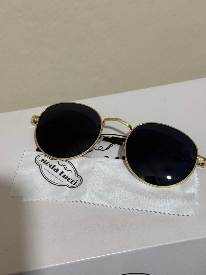 Parlak altın renkli, klasik yuvarlak çerçeveli bu güneş gözlüğü, bohem ve zahmetsiz şıklık için idealdir. Zamansız ve karşı kültür tarzını birleştirir. Toplu da satılır.