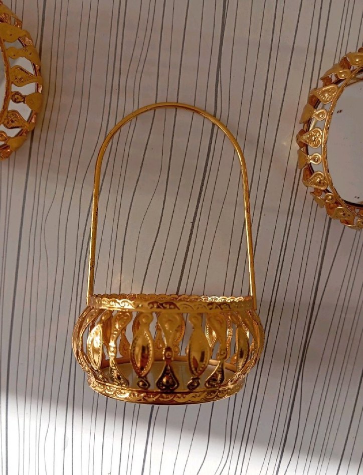 Parlak altın renkli, süslü açık işçilikli saplı sepet, dekoratif amaçlı kullanıma uygundur. lokum sunumluk