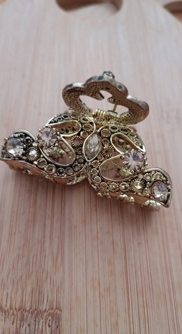 Parlak altın renkli metal saç tokası, sıralı taş detayları ve bohem tarzıyla dikkat çeker. Işıltılı ve zamansız bir görünüm sunar. ✨