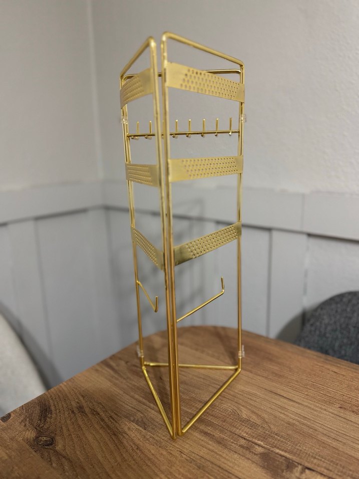 Parlak altın renkli takı ve aksesuarlar için çoklu askı ve bölmeler içerir. Çeyizim için almıştım hiç kullanmadım.