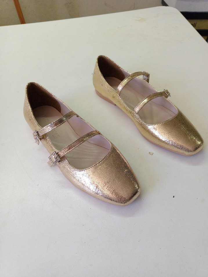 Parlak altın renkli tokalı, blok topuklu kadın babet, günlük kullanım için kauçuk malzemeden yapılmıştır.