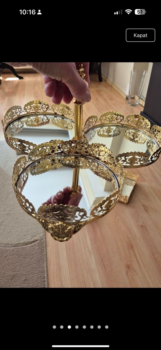 Sunum tepsisi dekoratif Parlak altın renkli üçlü ayna, zarif bir merkezi ayakla birleşerek vintage bir görünüm sağlar. ✨