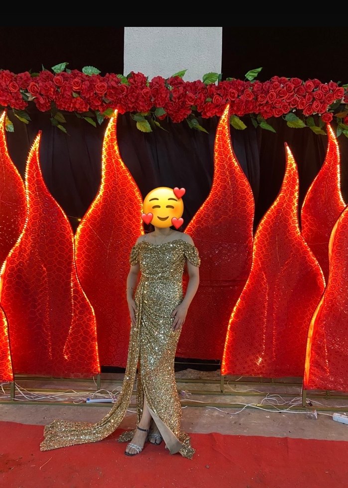 Düğünler için uygun, V yaka ve ince askılı, desenli ışıltılı altın renkli uzun ve vücuda oturan abiye elbise. ✨