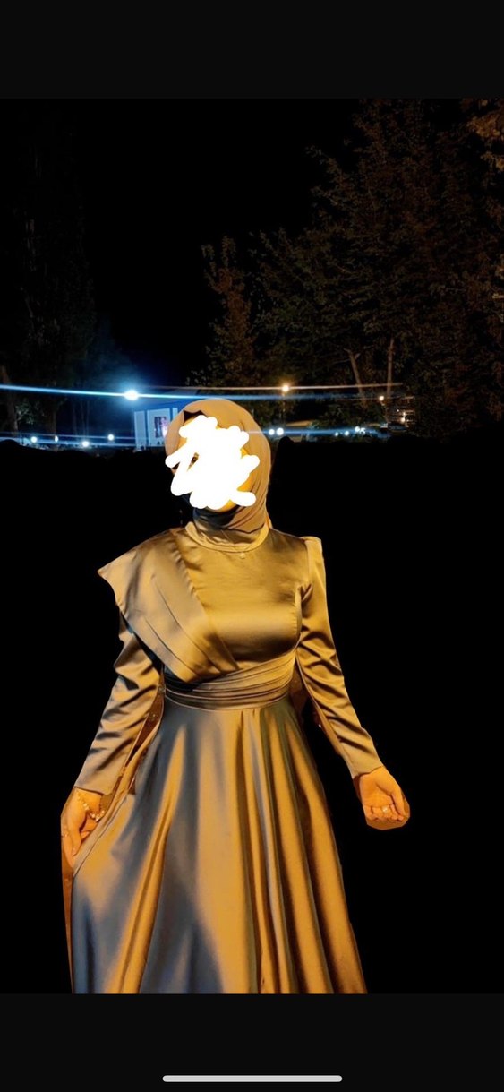 Parlak gümüş saten , uzun kollu ve yüksek yakalı kadın abiye elbise. Drapeli detayları ve vücuda oturan kesimiyle çağdaş ve avangart bir görünüm sunar.