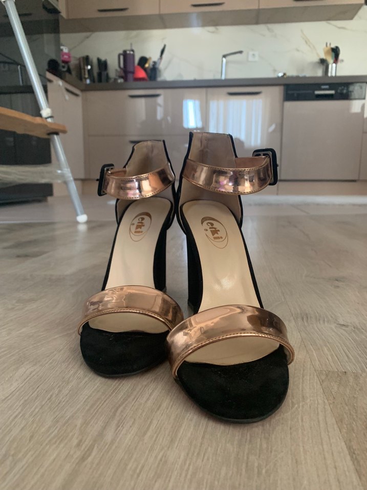 Parlak altın renkli, yılan desenli ince topuklu ayakkabılar, tokalı kayışlarla ve kauçuk malzemeden yapılmıştır. Romantik akşamlar için uygundur.