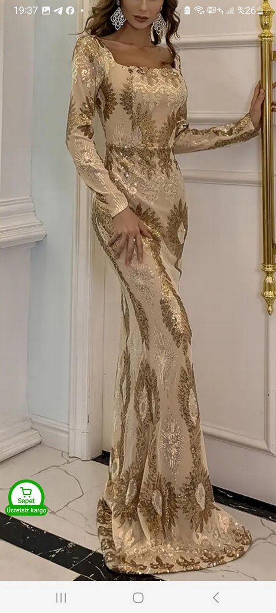 Parlak Altın Renkli Yılan Desenli Uzun Abiye Elbise