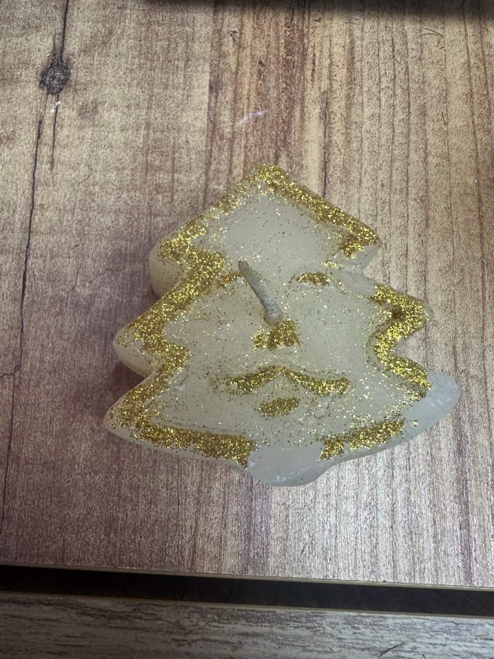 Yılbaşı ağacı şeklinde, parlak altın simlerle süslenmiş bir mumdur.