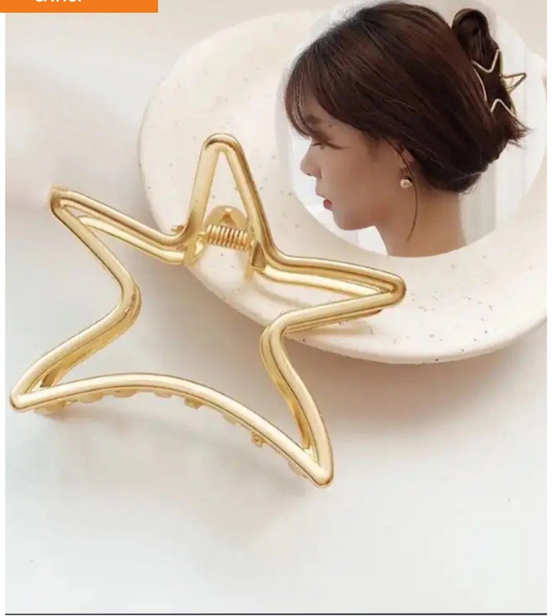 Parlak altın renkli metalden yapılmış, tokalı ve yıldız şekilli saç tokası, gösterişli bir görünüm sağlar. ✨