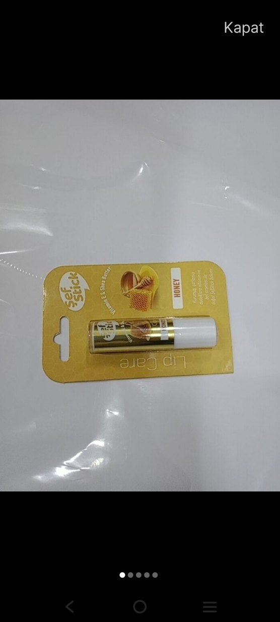 Parlak altın renkte ambalajda, bal aromalı dudak nemlendirici ve koruyucu bakım ürünü.