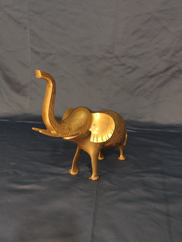 Parlak altın renkli, ayrıntılı tasarıma sahip, hortumu yukarı kalkık fil biblo. Full pirinç işleme detayları olan fil figürü Ürün göründüğü gibidir 1.5 kg 14 cm