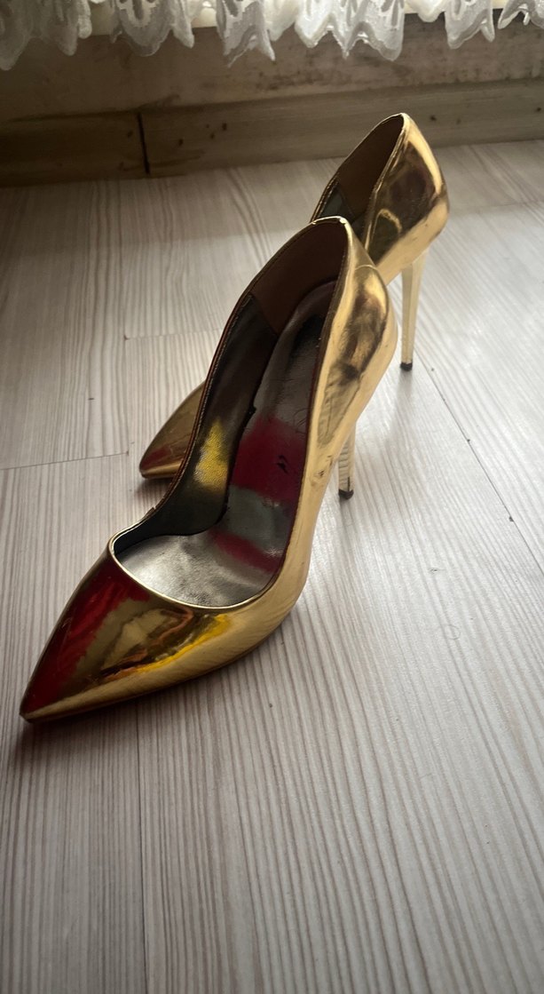 Parlak altın renkli, ince stiletto topuklu kadın ayakkabısı. Kauçuk malzemeden, parlak yüzeye sahip, romantik akşamlar için uygun. ✨
